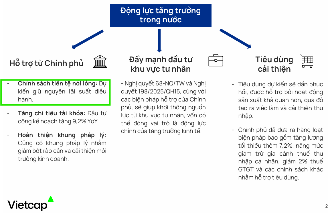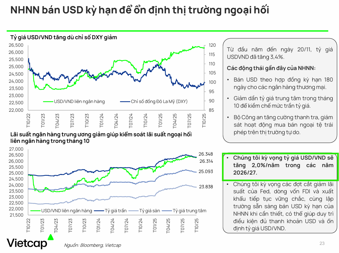 Vietcap dự báo chỉ số giá tiêu dùng bình quân năm 2026 sẽ ổn định ở mức 3.5%, nhờ giá dầu và giá gạo thế giới có xu hướng giảm. Về tỷ giá, USD/VND được dự báo tăng khoảng 2% mỗi năm. Các đợt cắt giảm lãi suất của Cục Dự trữ Liên bang Mỹ cùng dòng vốn đầu tư trực tiếp nước ngoài vững chắc sẽ giúp ổn định thanh khoản ngoại tệ.