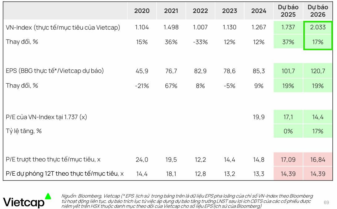 Mục tiêu VN-Index: Vietcap dự báo chỉ số đạt 2,033 điểm (+17% so với cuối 2025), nhờ EPS toàn thị trường tăng trưởng bền vững 19% trong hai năm liên tiếp (2025–2026).