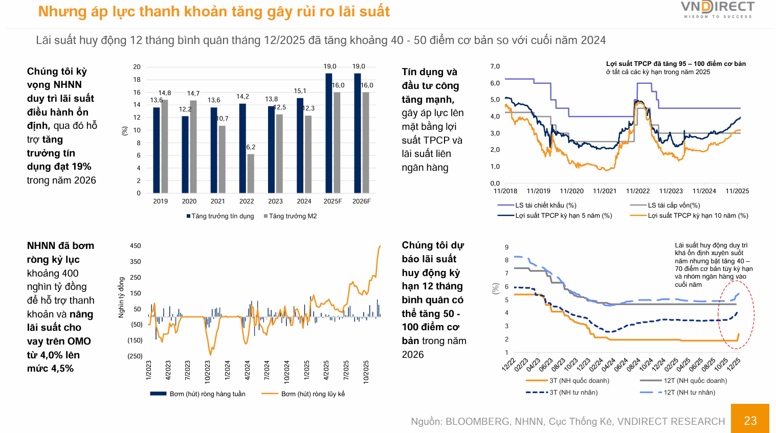 Tuy nhiên, áp lực thanh khoản từ nhu cầu tín dụng lớn cho hạ tầng và đầu tư công có thể khiến mặt bằng lãi suất huy động trên thị trường nhích tăng từ 50 đến 100 điểm cơ bản.