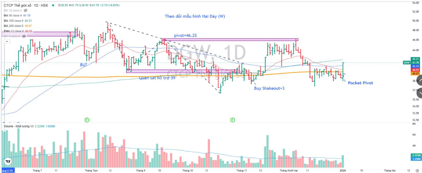 Trên đồ thị, RS của DGW là 75, hoạt động khá tốt trên thị trường. Ngày 5.1.2025, DGW tăng trần và có điểm mua Pocket Pivot, khả năng sẽ vào sóng vòng hai. Elibook Team đang nắm giữ MWG và FRT trong ngành bán lẻ, nên không khuyến nghị DGW.