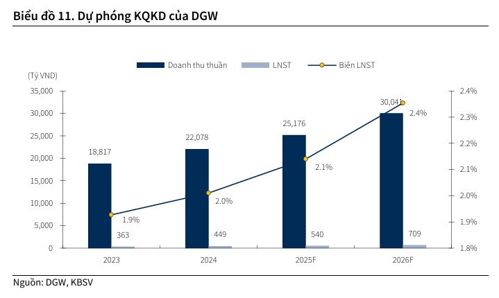 Dựa trên những phân tích về triển vọng ngành hàng, KBSV dự phóng doanh thu thuần của Digiworld trong năm 2026 sẽ đạt 30,041 tỷ đồng, tăng 19% so với dự báo của năm 2025.