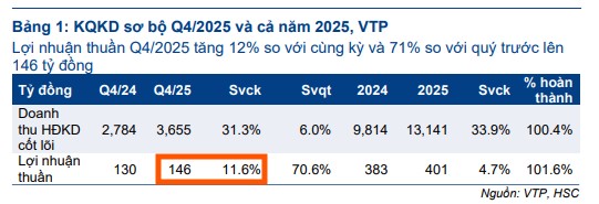Tính chung cho cả năm 2025, VTP ghi nhận doanh thu cốt lõi đạt 13,300 tỷ đồng, tăng trưởng mạnh mẽ 34% so với năm 2024. Lợi nhuận thuần cả năm đạt ngưỡng 400 tỷ đồng, tương ứng với mức tăng trưởng 4%, hoàn thành đúng 100% dự báo của HSC. Sự bứt tốc về doanh thu chủ yếu được thúc đẩy bởi mảng chuyển phát truyền thống (chiếm 80% tỷ trọng) và sự vươn lên mạnh mẽ của mảng logistics với tốc độ tăng trưởng vượt trội.