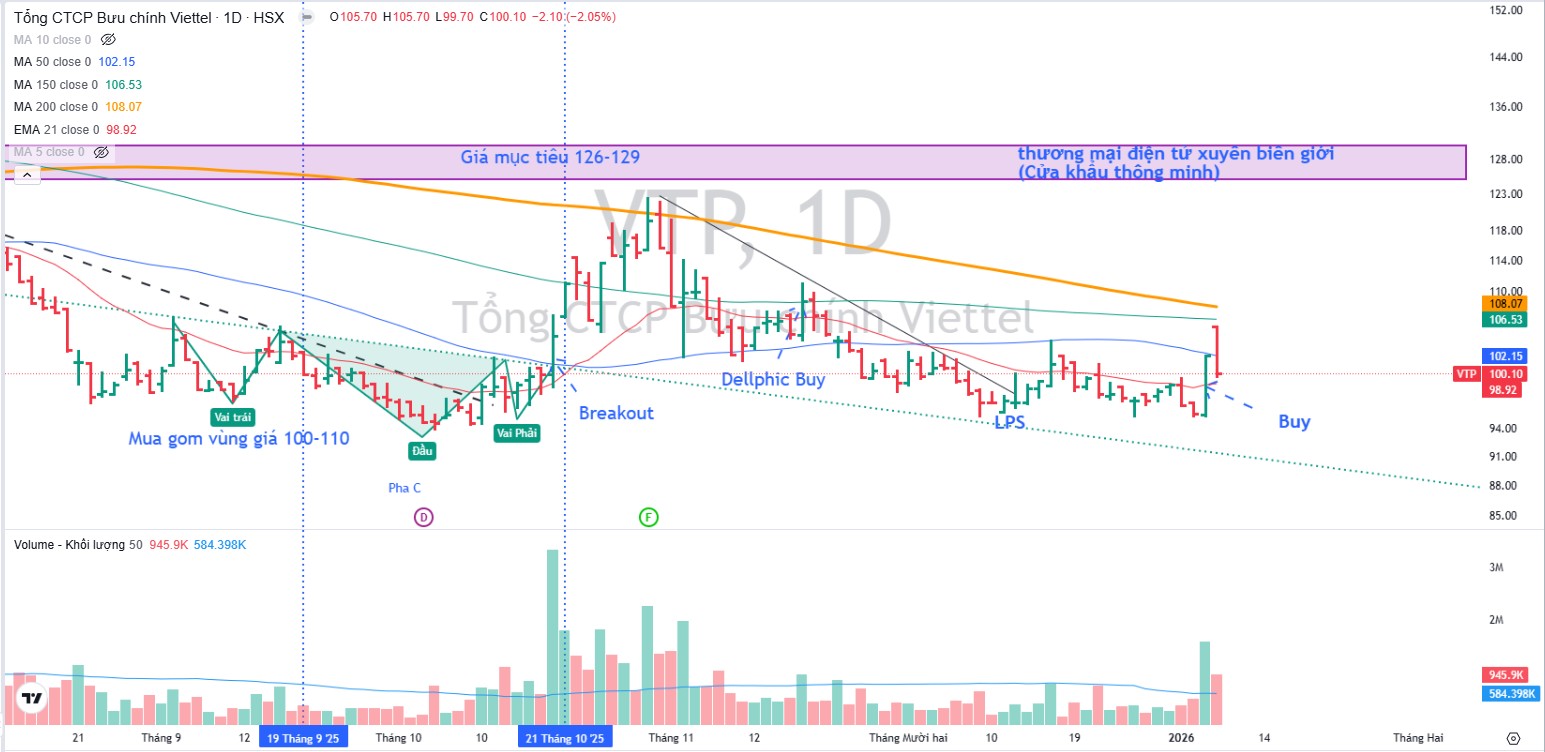 Trên đồ thị, RS của VTP là 39, hoạt động khá yếu trên thị trường. Sóng công nghệ vẫn chưa xuất hiện để hỗ trợ giá cổ phiếu. Tuy nhiên, ngày 7.1.2026, VTP xuất hiện điểm mua Bật Nảy (Bounce) từ EMA 21 ngày với thanh khoản lớn, khi có câu chuyện sóng thoái vốn nhà nước.