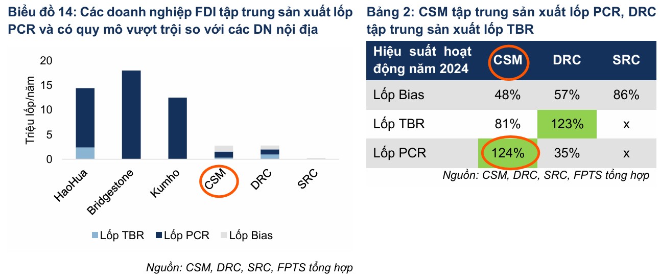 Thực sự, rất khó để cạnh tranh với các doanh nghiệp FDI tập trung sản xuất lốp Radial bán thép (PCR) dành cho xe ô tô con nên các doanh nghiệp nội địa sản xuất đủ từng loại lốp Bias và lốp Radial. Trong đó, CSM tập trung sản xuất dòng sản phẩm lốp Radial bán thép dành cho xe ô tô con (PCR), DRC chủ yếu sản xuất lốp Radial toàn thép dành cho xe tải – xe buýt (TBR), SRC không sản xuất lốp ô tô Radial. Ngoài ra, các doanh nghiệp nội địa còn sản xuất lốp ô tô Bias dành cho các loại xe tải, xe chuyên dụng (xe công nghiệp, xe nông nghiệp, xe công trình).