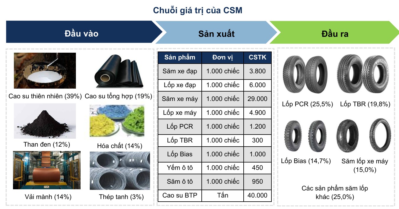 Chi phí nguyên vật liệu chiếm 70% tổng chi phí sản xuất kinh doanh của CSM năm 2024. Trong đó, cao su thiên nhiên là nguyên vật liệu chính, chiếm 39.0% và được cung cấp hoàn toàn bởi các doanh nghiệp cao su trong nước như Phước Hòa, Đồng Phú,… nhờ nguồn cung dồi dào. Các nguyên vật liệu khác (chiếm khoảng 58.5%) bao gồm cao su tổng hợp (19.0%), vải mành (14.0%), các loại hoá chất (13.5%) và than đen (12.0%) được nhập khẩu từ các nhà cung cấp nước ngoài và biến động theo diễn biến giá dầu thô.