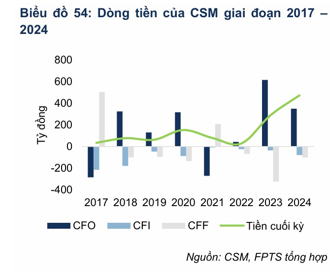 Trong giai đoạn 2017 – 2024, dòng tiền từ hoạt động kinh doanh (CFO) của CSM nhìn chung duy trì trạng thái dương 200-400 tỷ mỗi năm phản ánh khả năng tạo ra dòng tiền ổn định
