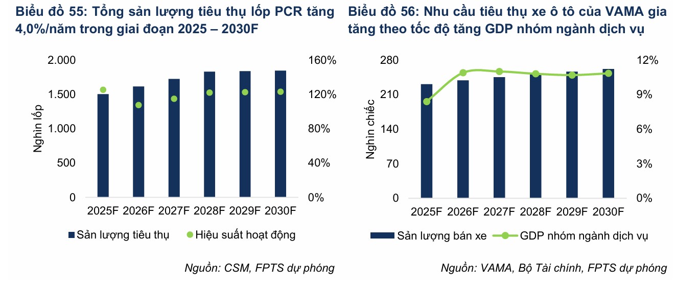 Mảng lốp ô tô Radial bán thép (PCR) tiếp tục khẳng định vai trò là đầu tàu tăng trưởng của Casumina. FPTS dự phóng doanh thu mảng này sẽ tăng trưởng ổn định với tốc độ bình quân 6.2% mỗi năm trong giai đoạn 2026-2030.
