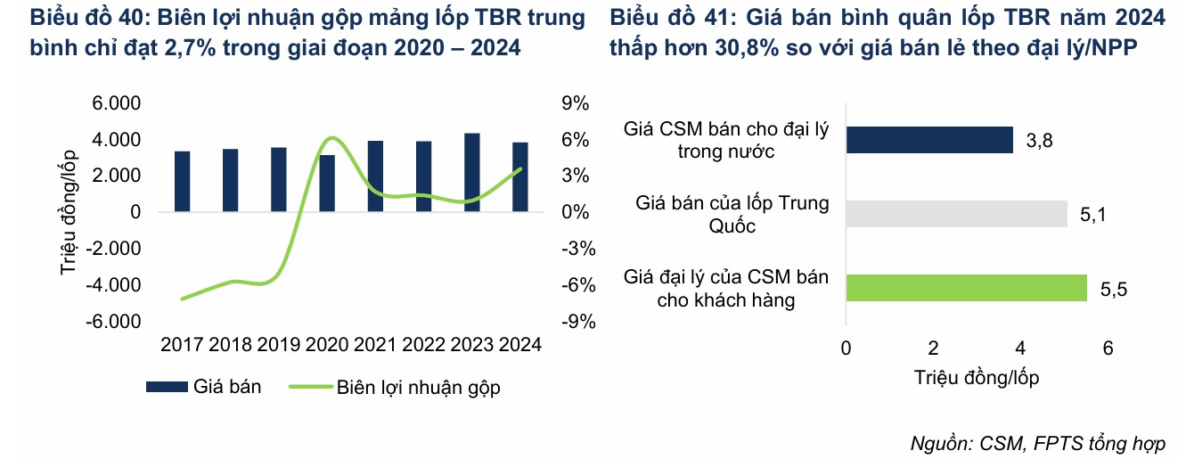 Theo đó, năm 2024, giá CSM bán cho đại lý/NPP trong nước chỉ đạt khoảng 893 nghìn đồng/lốp, thấp hơn 44.2% so với mức giá đại lý/NPP của CSM bán cho khách hàng (khoảng 1.6 triệu đồng/lốp).