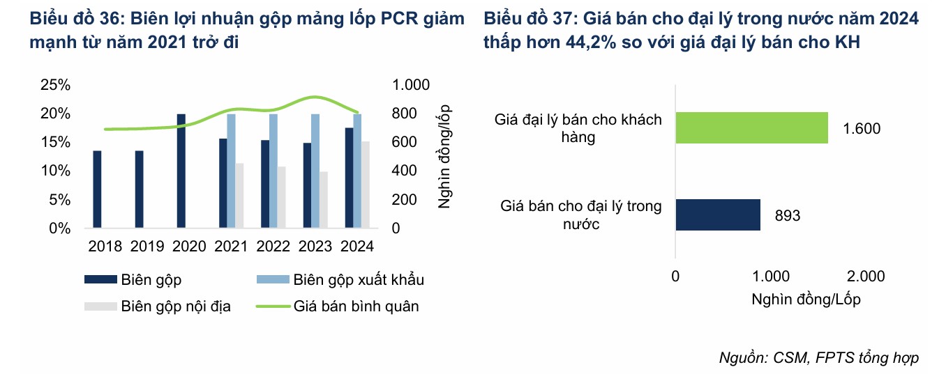 Biên lợi nhuận gộp mảng lốp PCR giai đoạn 2021 – 2024 suy giảm 4.1 đpt so với 2019 do (1) chi phí khấu hao gia tăng khi doanh nghiệp mua sắm các thiết bị, máy móc phục vụ cho việc hoạt động vượt công suất từ năm 2022; (2) biên lợi nhuận gộp lốp PCR nội địa thấp hơn so với biên gộp lốp PCR xuất khẩu do CSM không thể tăng giá bán đầu ra tương ứng với mức tăng giá nguyên vật liệu do bối cảnh cạnh tranh gay gắt ở thị trường lốp xe con trong nước, trong khi phải tăng chiết khấu cho đại lý và nhà phân phối trong nước.