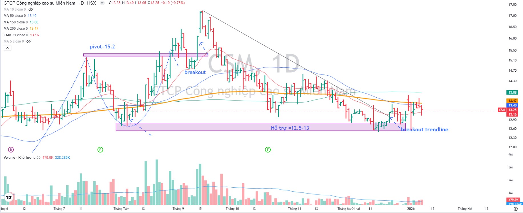 Elibook Team khuyến nghị tiếp tục mua gom CSM ở vùng giá hỗ trợ 12,600-13,000 đồng. Thậm chí, chờ đợi điểm pocket pivot vượt 13,500 đồng để bổ sung thêm vị thế.