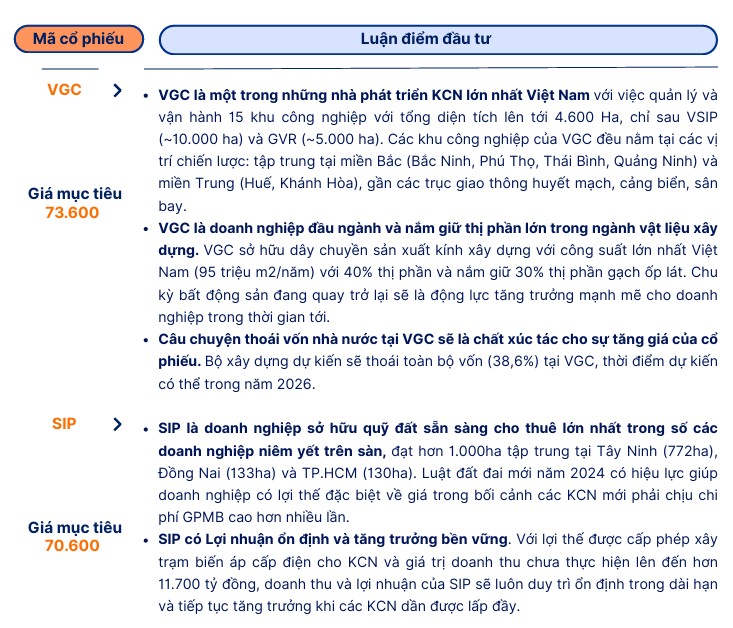 | VGC | Quản lý 15 KCN (4,600 ha), vị trí chiến lược miền Bắc. Hưởng lợi từ chu kỳ vật liệu xây dựng và câu chuyện thoái vốn nhà nước năm 2026. | 73,600 |