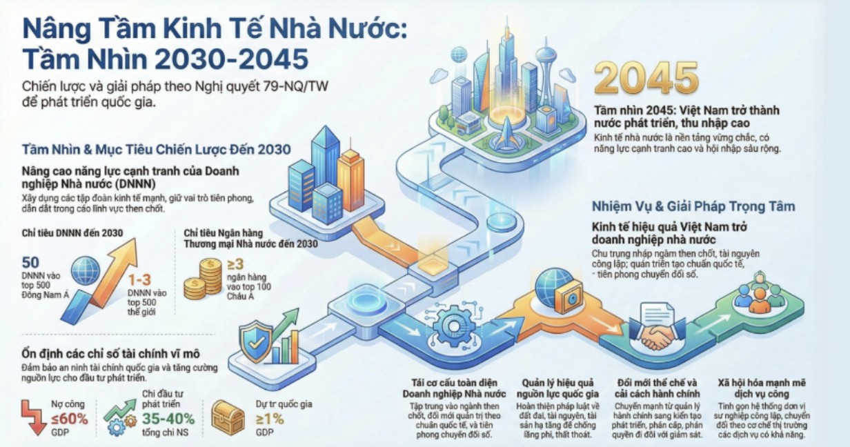 Mục tiêu Nghị quyết 79: Đến 2030, Việt Nam phấn đấu có 50 DNNN vào Top 500 Đông Nam Á, 1–3 DNNN vào Top 500 toàn cầu; đến 2045 nâng lên 60 và 5 doanh nghiệp tương ứng.