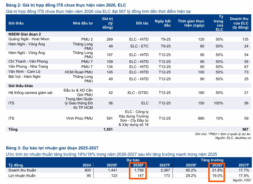 Triển vọng của ELC trong năm 2026 tiếp tục được củng cố bởi danh mục dự án chưa thực hiện (backlog) khá lớn. Các liên danh của ELC đã trúng thầu khoảng 67% tổng giá trị các gói thầu ITS của dự án Cao tốc Bắc – Nam giai đoạn 2, tương đương giá trị doanh thu kỳ vọng cho riêng ELC là 430 tỷ đồng.