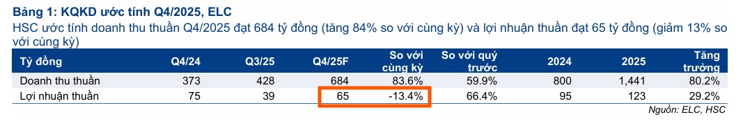 HSC ước tính doanh thu thuần quý 4/2025 của ELC sẽ đạt mức 684 tỷ đồng, ghi nhận mức tăng trưởng ấn tượng 84% so với cùng kỳ năm trước và 60% so với quý trước.