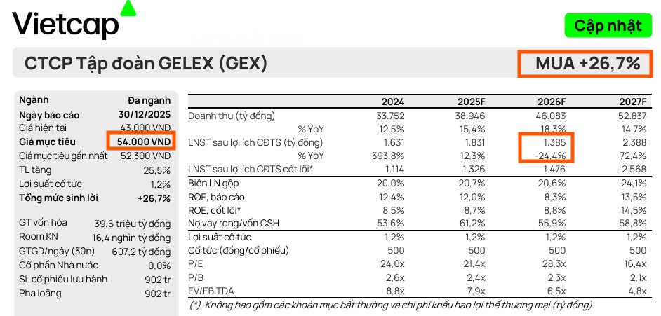 Vietcap (31.12.2025) đã điều chỉnh tăng giá mục tiêu của Công ty Cổ phần Tập đoàn GELEX (GEX) thêm 3.3% lên 54,000 đồng và nâng khuyến nghị lên MUA