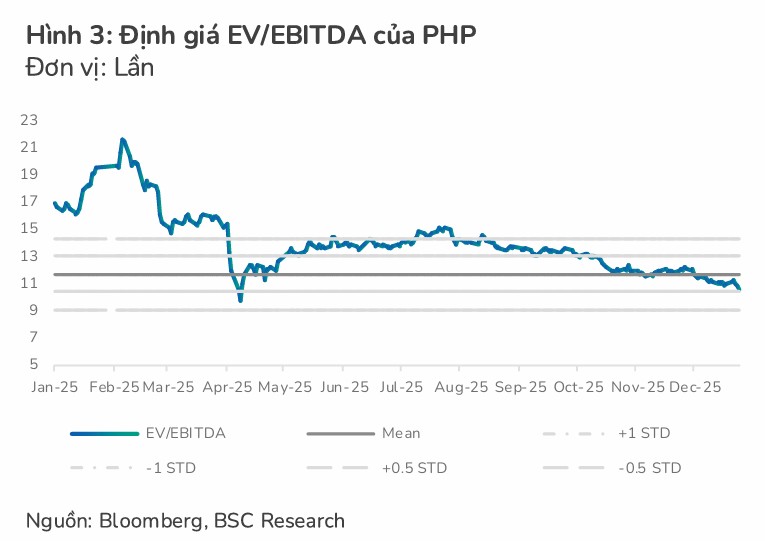 Hiện tại, cổ phiếu PHP đang giao dịch với mức EV/EBITDA là 10.6 lần, thấp hơn mức trung bình 5 năm. BSC cho rằng tiềm năng tăng trưởng định giá của PHP sẽ phụ thuộc hoàn toàn vào tốc độ khai thác và hiệu quả của cảng nước sâu Lạch Huyện 3-4 trong thời gian tới.