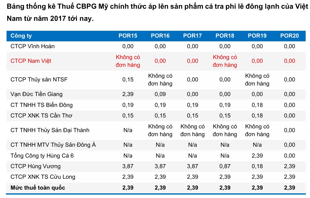 | Thế mạnh tại Mỹ | Chiếm 87-89% thị phần cá rô phi Việt Nam xuất khẩu sang Mỹ; hưởng thuế CBPG 0%. | Cá rô phi chiếm 85% giá trị xuất khẩu của ANV sang Mỹ; hưởng lợi khi Mỹ áp thuế cao với Trung Quốc. |