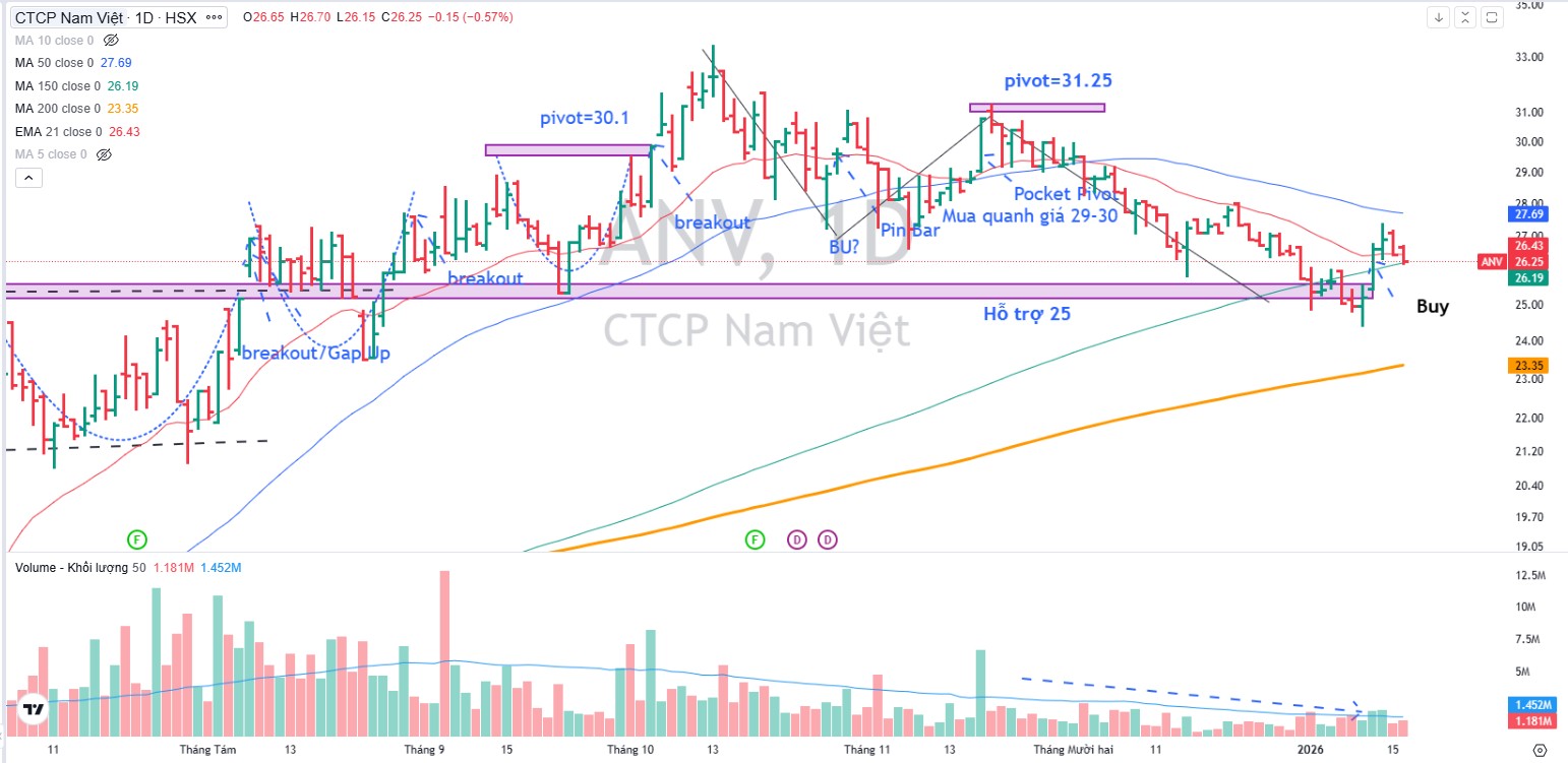 Trên đồ thị, RS của ANV là 51, hoạt động ở mức trung bình. Ngày 13.1.2025, ANV vượt qua EMA 21 ngày tạo điểm mua ở vùng giá quanh 26,000 đồng.