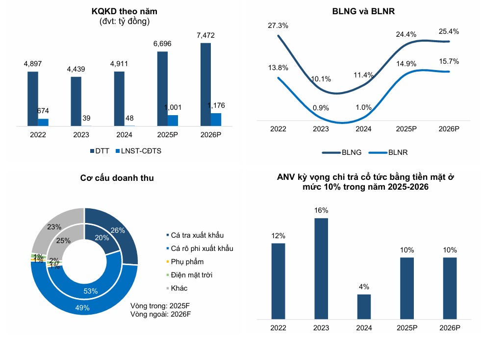 BVSC dự phóng doanh thu thuần và lợi nhuận sau thuế của cổ đông công ty mẹ năm 2025 của ANV lần lượt đạt 6,696 tỷ đồng và 1,001 tỷ đồng, tăng trưởng gấp 20 lần so với năm 2024.