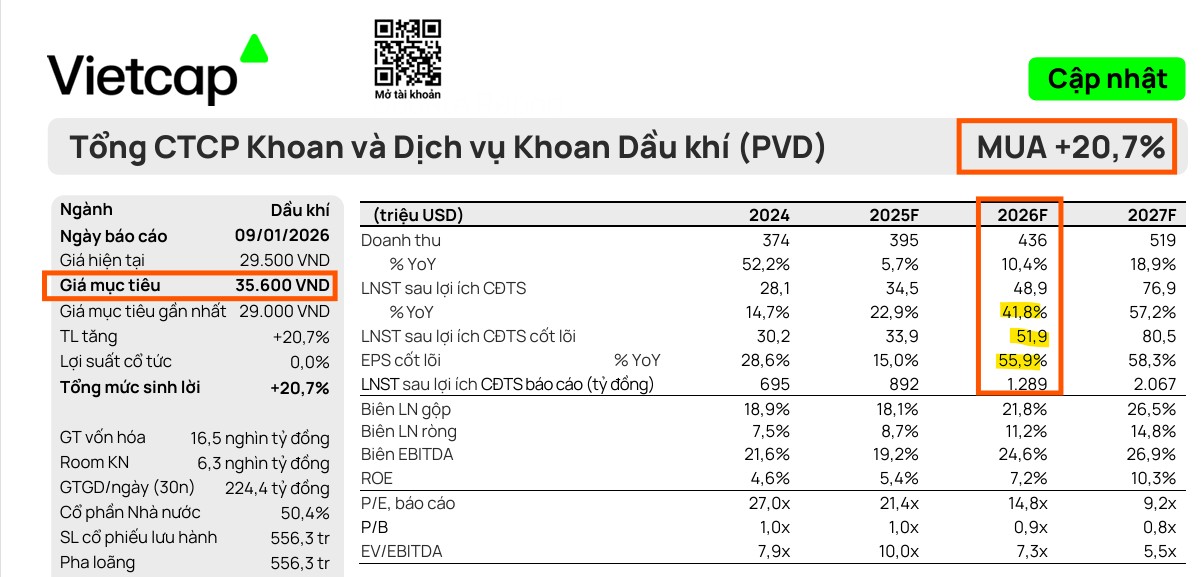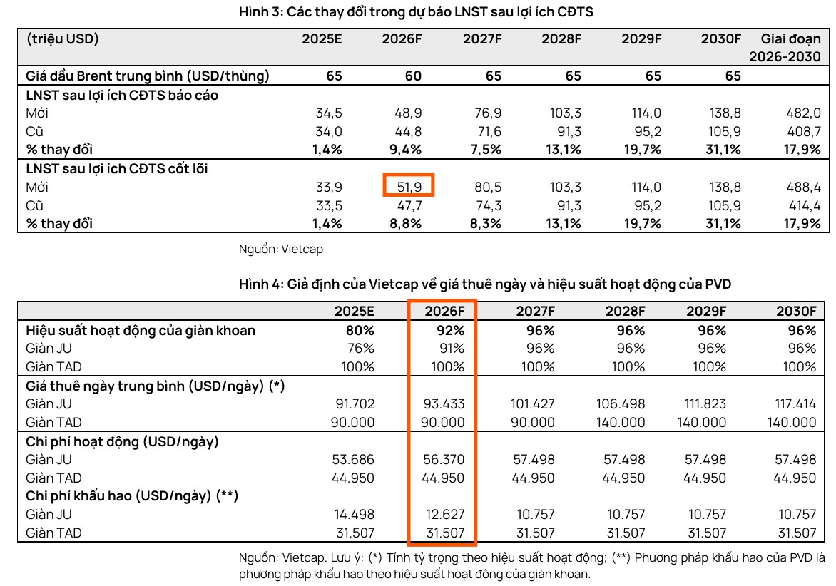 Vietcap dự báo lợi nhuận sau thuế (LNST) sau lợi ích cổ đông thiểu số cốt lõi năm 2026 của PVD sẽ đạt 51.9 triệu USD, tăng mạnh 53% so với năm 2025.