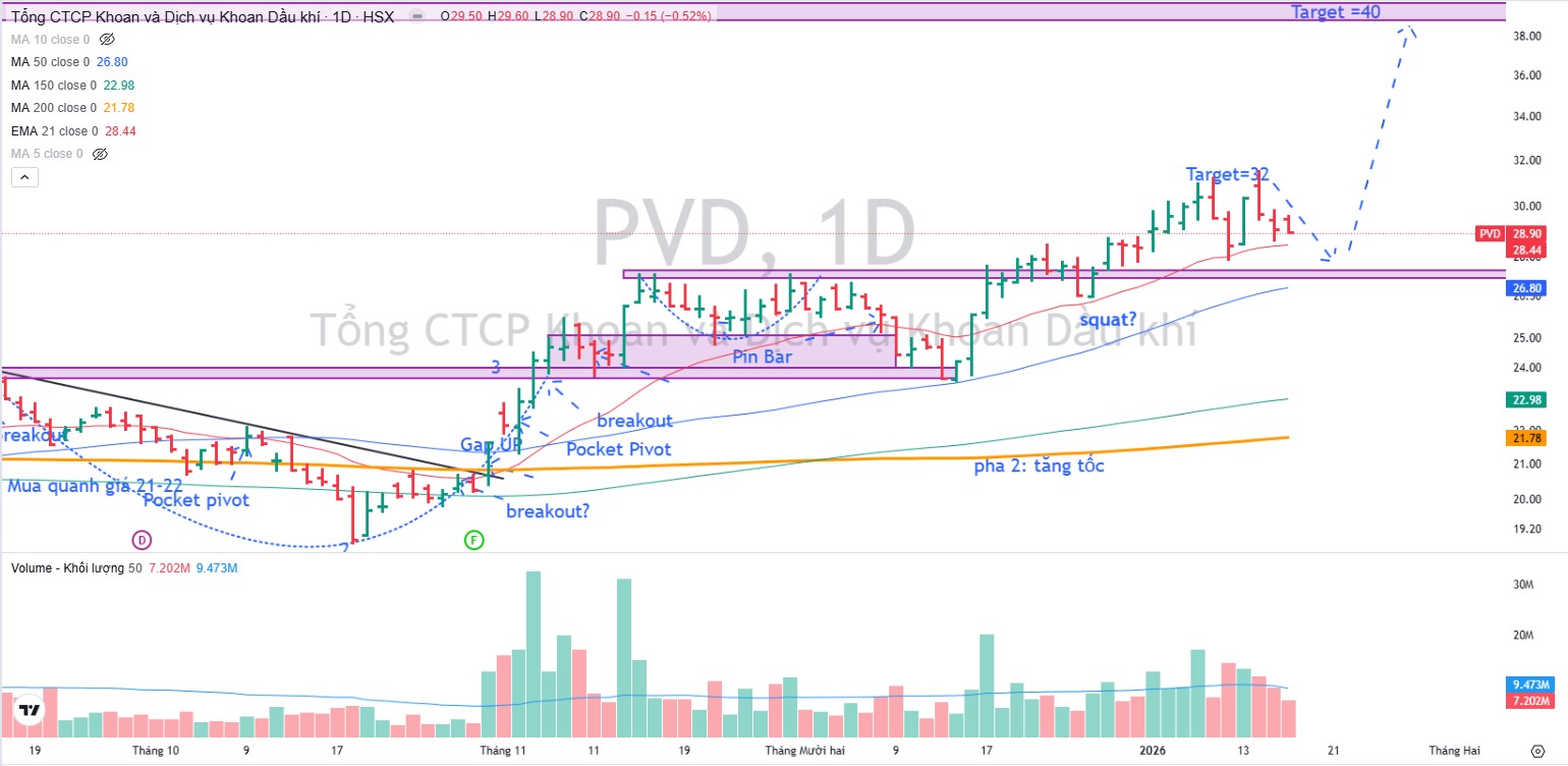 - Kết quả & kế hoạch: LNST cốt lõi 2026 dự báo đạt 51.9 triệu USD (+53% YoY), nhờ hiệu suất giàn tự nâng phục hồi 96%, giá thuê ngày tăng, cùng đóng góp mới từ giàn PVD VIII và PVD IX. PVD dự kiến đầu tư thêm giàn PVD X (83 triệu USD) cuối 2026 để duy trì đà tăng trưởng dài hạn.