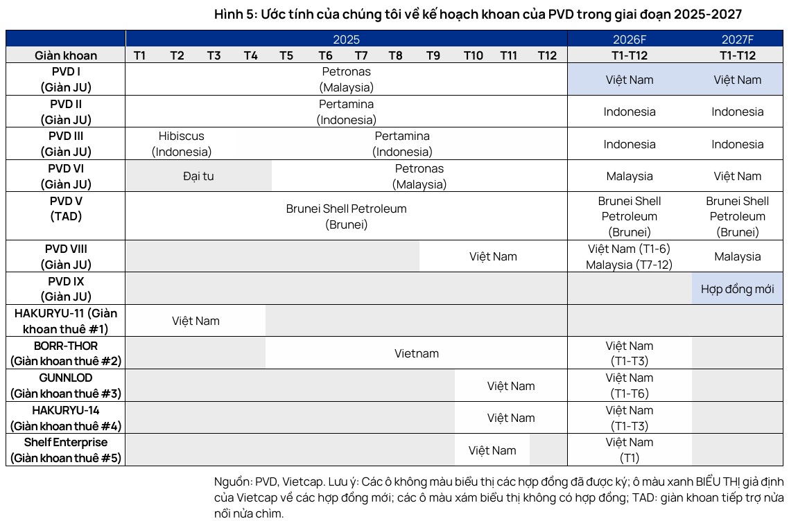 Vietcap giả định doanh nghiệp sẽ mua thêm một giàn tự nâng mới (PVD X) với vốn đầu tư khoảng 83 triệu USD vào cuối năm 2026. Giàn khoan này dự kiến bắt đầu đóng góp đầy đủ vào lợi nhuận từ năm 2028, đóng vai trò là động lực tăng trưởng dài hạn quan trọng.