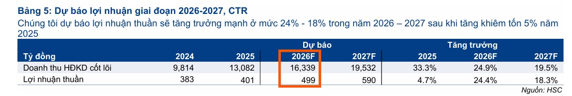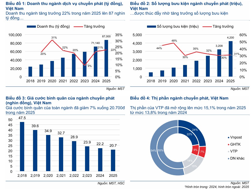 HSC dự báo lợi nhuận thuần của VTP sẽ tăng trưởng mạnh mẽ ở mức 24% trong năm 2026 , đạt 499 tỷ đồng, và 18% trong năm 2027, đạt 590 tỷ đồng. Động lực chính đến từ sự bùng nổ của thương mại điện tử và việc tối ưu hóa chi phí vận hành.