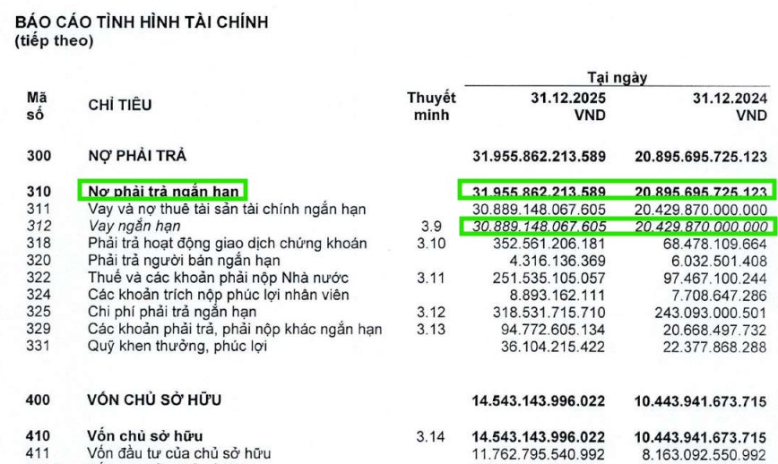Tuy nhiên, HCM vẫn cho thấy khả năng xoay nguồn tốt. Cuối năm 2025, nợ ngắn hạn của HCM tăng 52% so với đầu năm, lên 30 nghìn tỷ (giảm nhẹ so với quý 4 là 34 nghìn tỷ), chủ yếu là vay ngân hàng để tài trợ cho hoạt động cho vay margin.