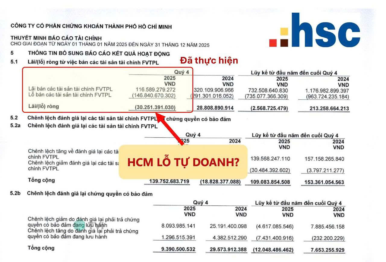 Phiên ngày 21.1.2026, cổ phiếu HCM nằm sàn sau thông tin công ty chứng khoán HSC (mã HCM) đã bán mạnh danh mục tự doanh trong Quý 4/2025, đặc biệt là các mã “trụ” như BID, VCB, GAS ngay trước thềm sóng tăng đầu năm 2026. Kỳ vọng về khoản lãi vài trăm tỷ bỗng chốc biến thành lỗ -30 tỷ là nguyên nhân khiến nhiều nhà đầu tư thất vọng và tháo chạy.