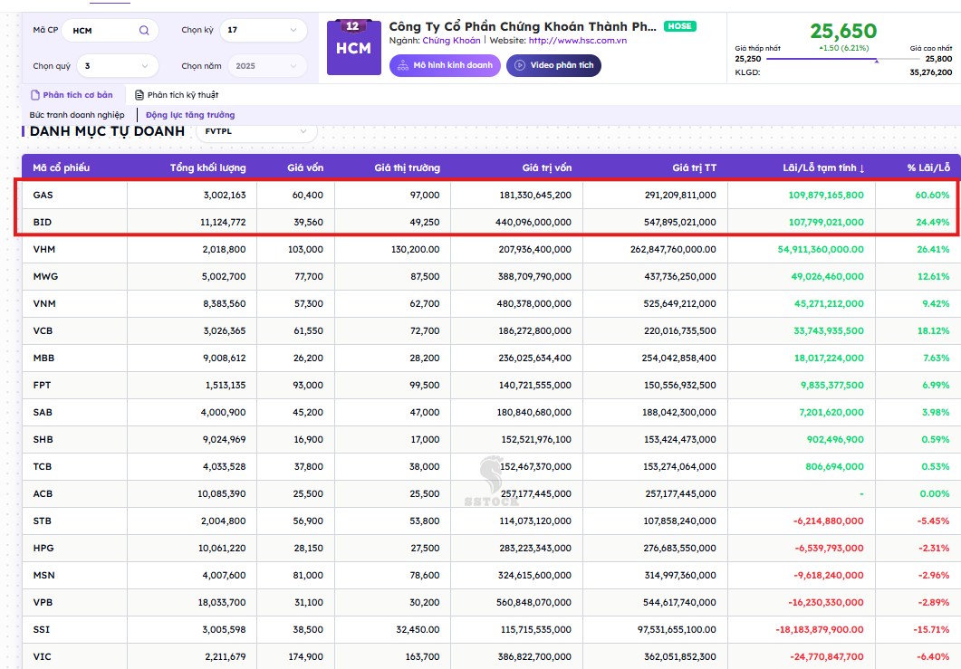 Theo đó, doanh mục tự doanh của HCM có thể liên quan đến việc cầm hộ hàng (như case FPT hồi đầu năm 2025), sử dụng để thu lãi khi gặp trường hợp cạn nguồn margin cho vay, làm nhà tạo lập chứng quyền và ETF…