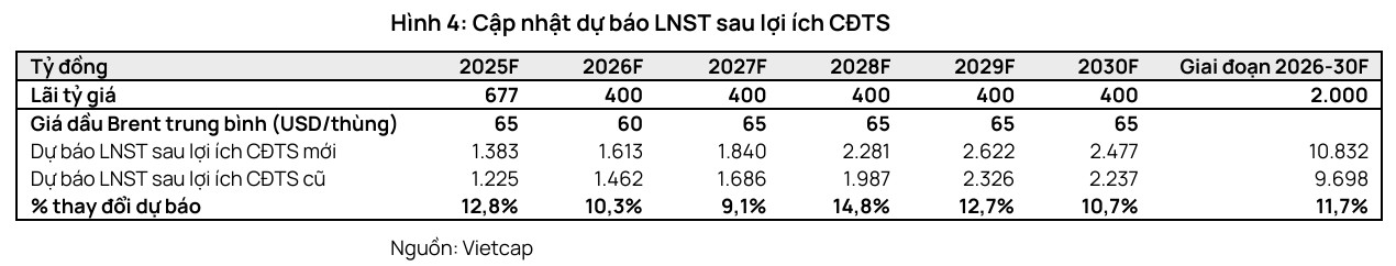 Vietcap ước tính lãi tỷ giá thuần sẽ đạt khoảng 677 tỷ đồng trong năm 2025 và duy trì trung bình 400 tỷ đồng mỗi năm trong giai đoạn 2026–2030. Đây được xem là khoản thu mang tính ổn định và bền vững, phản ánh sự mở rộng mạnh mẽ của PVS tại các thị trường nước ngoài.