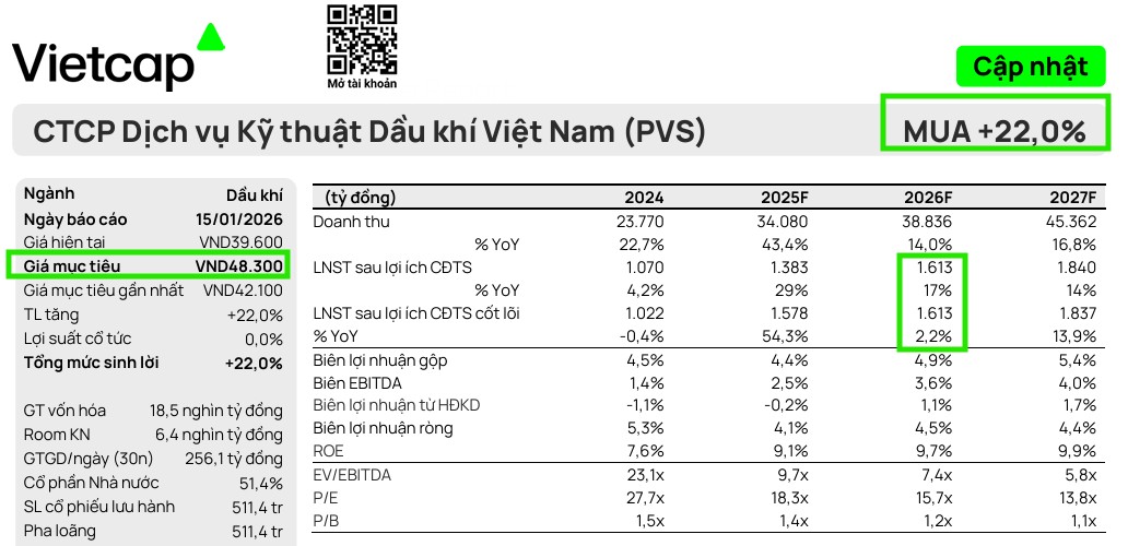 Vietcap (15.1.2026) đã điều chỉnh tăng giá mục tiêu của PVS thêm 15% lên mức 48,300 đồng/cổ phiếu, đồng thời duy trì khuyến nghị Mua dựa trên triển vọng lợi nhuận khả quan và vị thế đầu ngành dịch vụ kỹ thuật dầu khí.