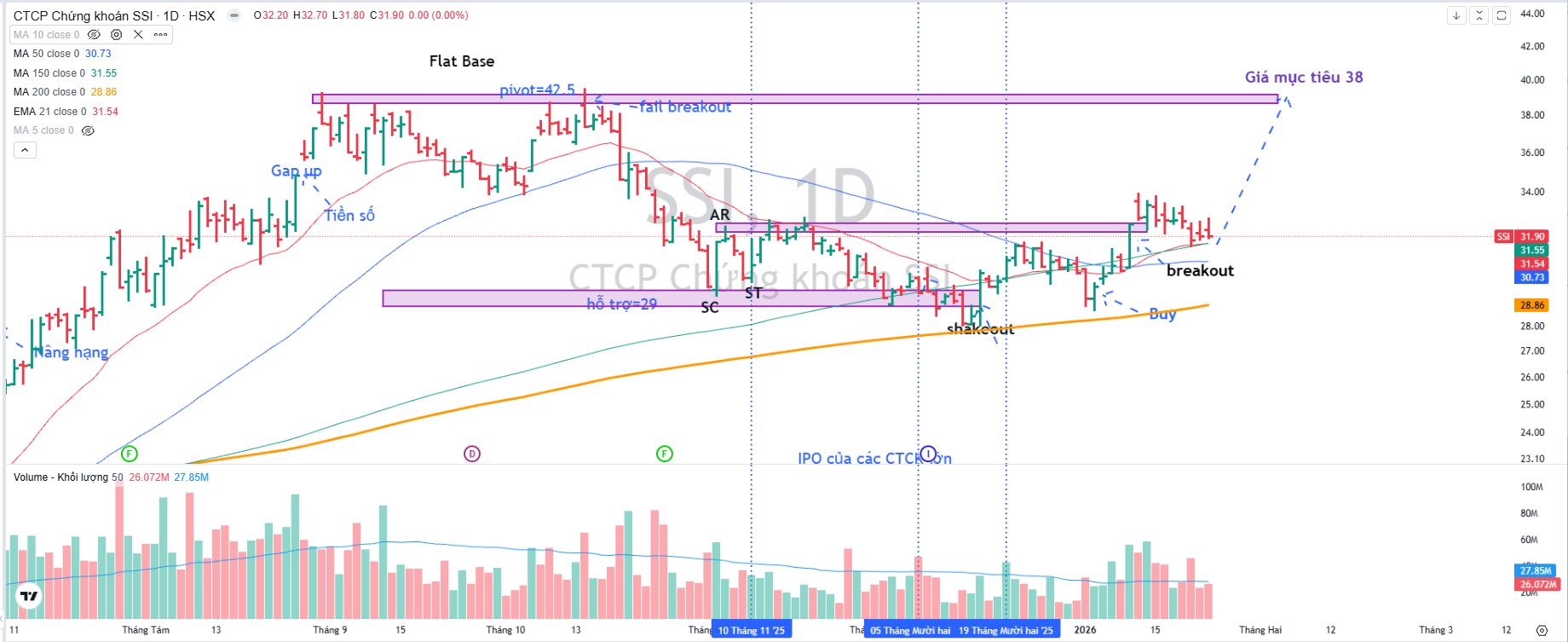 Sau khi tạo đáy tháng 12 trong cấu trúc Wyckoff (sự kiện Spring pha C), cổ phiếu SSI đang bắt đầu thoát khỏi vùng tích lũy 28,000-32,000. Do đó, việc giá điều chỉnh về vùng giá quanh 31,000 là một giai đoạn LPS cung cấp điểm mua.