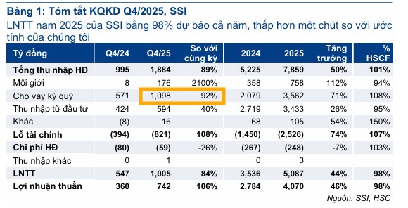 Kết quả kinh doanh 2025: SSI đạt 5,087 tỷ đồng LNTT, tăng 44% YoY, hoàn thành 98% dự báo; riêng Q4/2025 đạt 1,005 tỷ (+84% YoY) dù giảm so với mức nền cao quý 3 (hơn 1,700 tỷ).