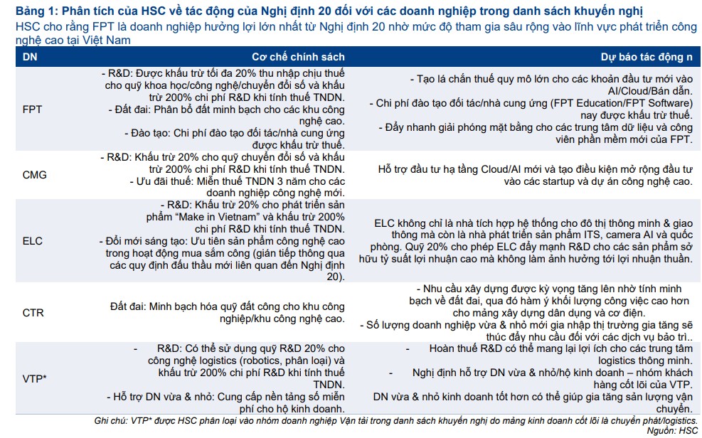 HSC duy trì quan điểm tích cực đối với các cổ phiếu đầu ngành. FPT vẫn là ưu tiên hàng đầu nhờ khả năng tận dụng lá chắn thuế cho các mảng AI và Cloud. CMG và ELC có lợi thế lớn trong việc khấu trừ chi phí R&D cho các sản phẩm “Make in Vietnam”.