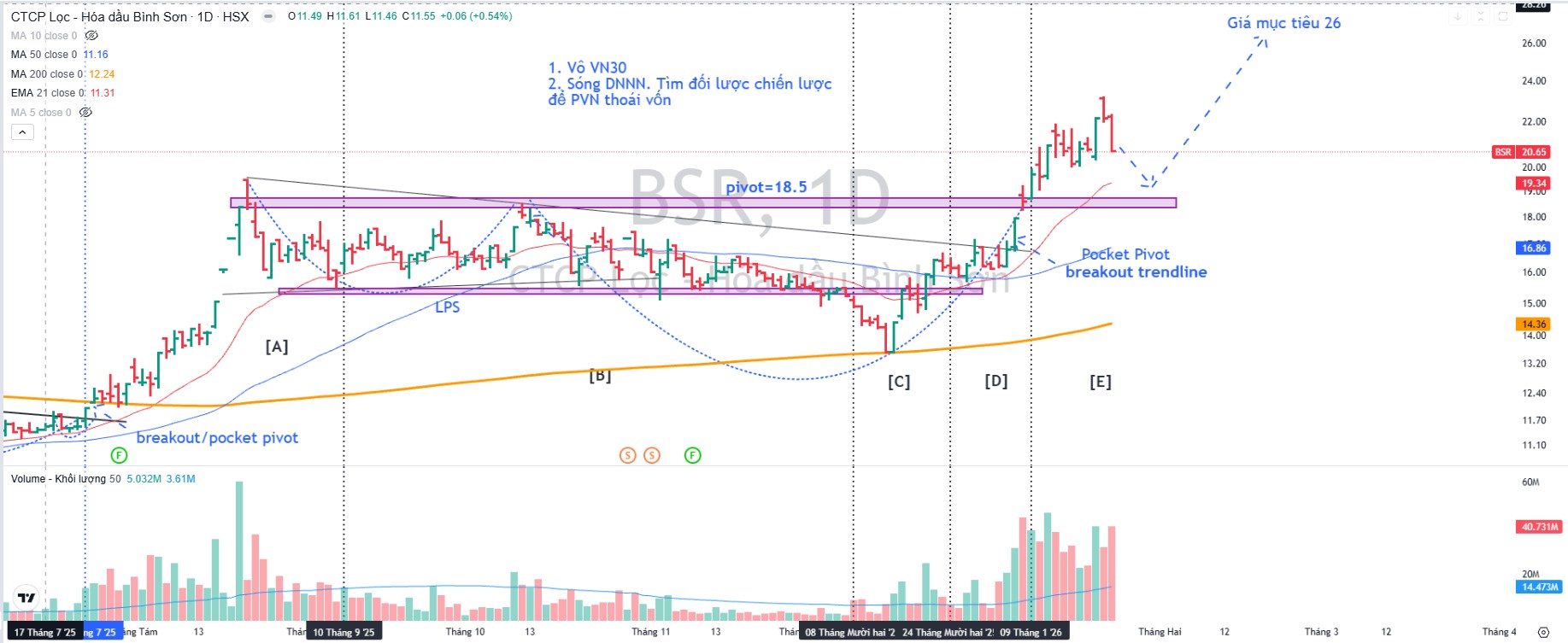 Trên đồ thị, RS của BSR là 96, hoạt động vượt trội trên thị trường. Sóng DNNN đã là yếu tố hỗ trợ giá cho BSR. Khả năng BSR đang pullback về EMA 21 ngày, quanh vùng giá 19,000-20,000 để tìm điểm hỗ trợ, sau đó tiếp tục xu hướng tăng.