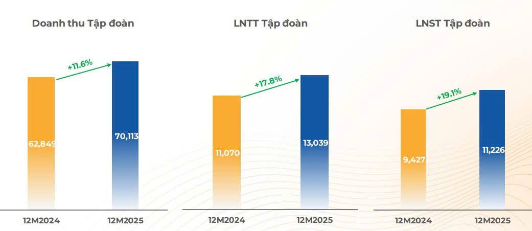 Kết thúc năm 2025, FPT ghi nhận doanh thu thuần đạt 70,112 tỷ đồng, tăng 11.6% so với năm trước. Lợi nhuận sau thuế đạt 11,226 tỷ đồng, tăng trưởng ấn tượng 19%.