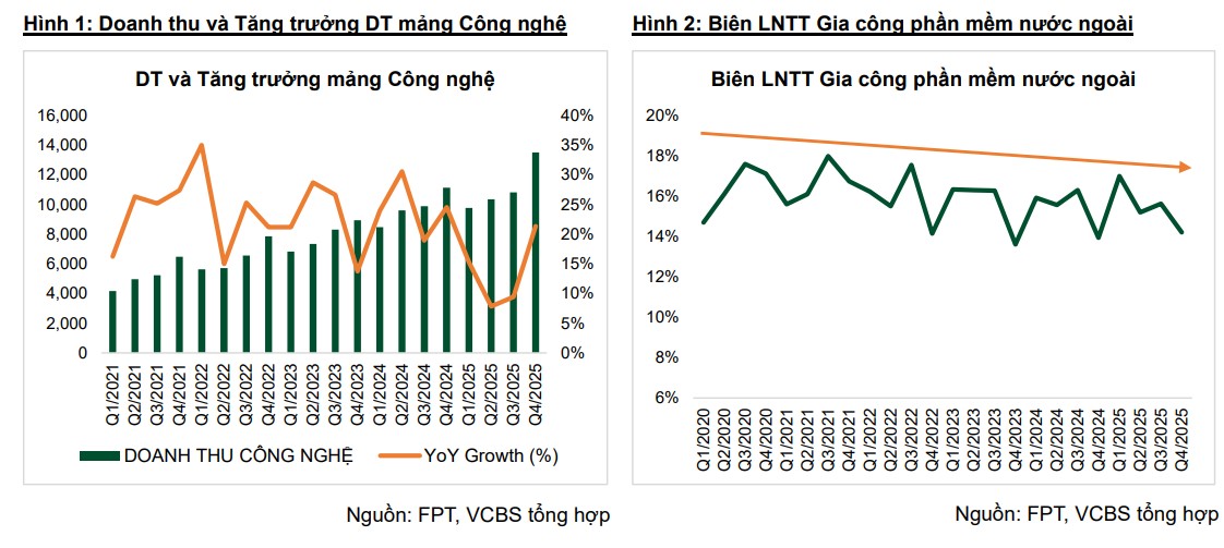 Tại Châu Âu, FPT cũng ghi nhận tốc độ tăng trưởng phi mã 36.3%, củng cố vị thế nhà cung cấp dịch vụ công nghệ toàn cầu. Tuy nhiên, biên lợi nhuận trước thuế mảng gia công phần mềm có sự sụt giảm nhẹ do áp lực cạnh tranh từ các đối thủ ứng dụng AI tạo sinh để tối ưu giá thầu.
