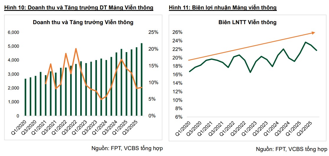 Mảng viễn thông & thách thức: Doanh thu viễn thông 2025 đạt 19,507 tỷ đồng, duy trì vai trò “con gà đẻ trứng vàng” nhờ hiệu ứng quy mô. Tuy nhiên, mảng Cloud AI (AI Factory) gặp khó do cạnh tranh GPU và mảng Giáo dục chững lại. VCBS khuyến nghị MUA với giá mục tiêu 121,909 đồng/cp
