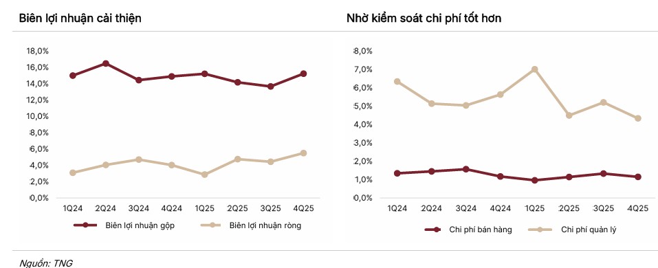 Đặc biệt, trong quý 4/2025, lợi nhuận ròng bùng nổ 50% nhờ sự đóng góp tích cực từ phân khúc hàng cao cấp và năng suất lao động cải thiện rõ rệt.