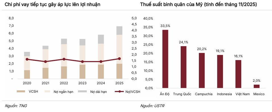 Triển vọng 2026: TNG tiếp tục định hướng mở rộng thị trường xuất khẩu, tập trung vào hàng cao cấp và nâng cao năng lực sản xuất, kỳ vọng duy trì tăng trưởng lợi nhuận cao hơn tốc độ tăng doanh thu. LNST năm 2026 dự kiến tăng trưởng 9%-11%, đạt 430 tỷ đồng. Định giá hấp dẫn với P/E 2026 chỉ 6.5 lần trong khi tỷ suất cổ tức lên tới 11%.