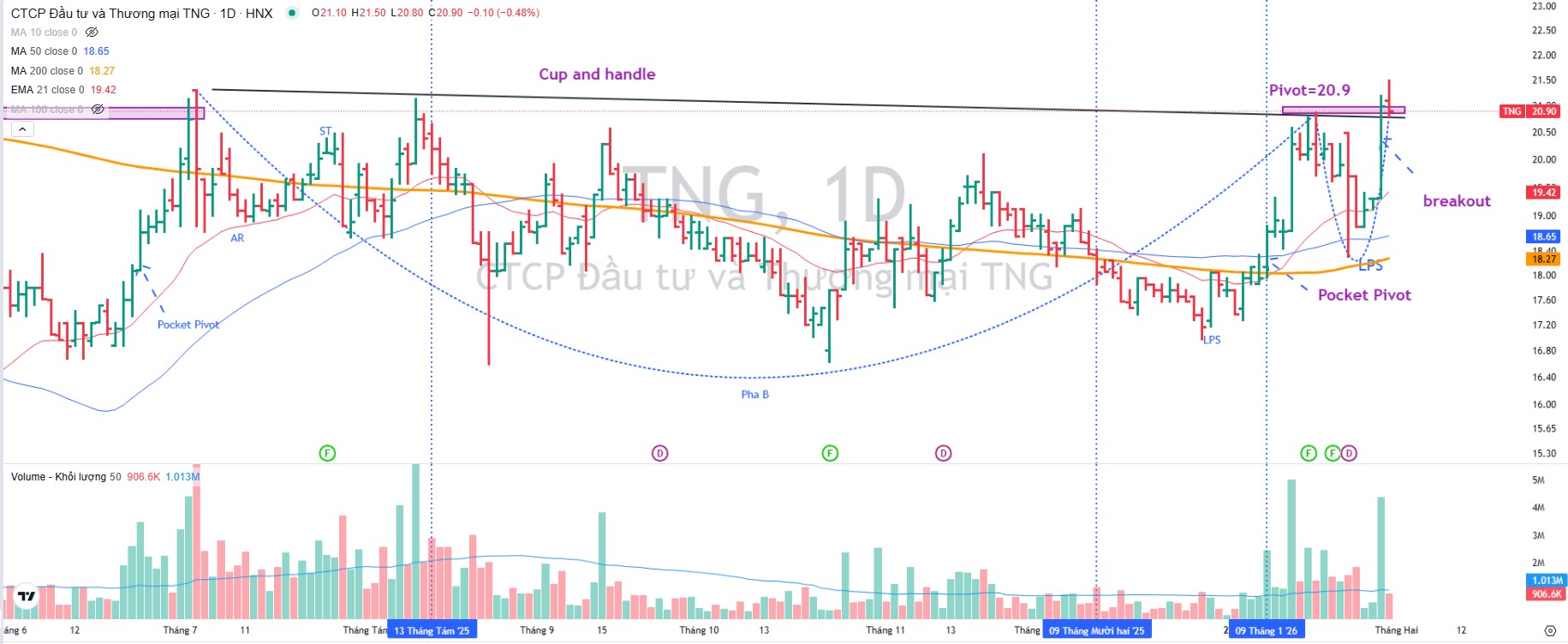 Trên đồ thị, RS của TNG là 89, hoạt động tốt trên thị trường. Ngày 29.1.2026, TNG breakout mẫu hình Chiếc Cốc Tay Cầm, vượt qua điểm mua 20,900 đồng.