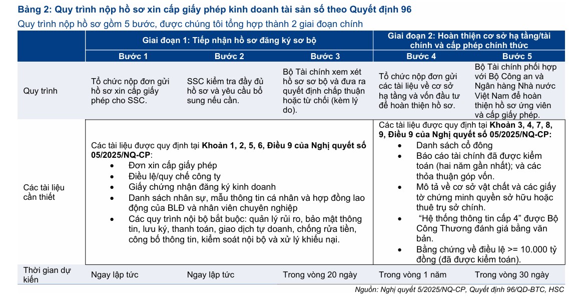 HSC dự báo quy trình cấp phép sẽ kéo dài từ 3 đến 6 tháng, đồng nghĩa với việc những giấy phép chính thức đầu tiên có thể được cấp vào quý 2/2026. Khi các hướng dẫn bổ sung được hoàn thiện vào giữa năm, sàn giao dịch tài sản số trong nước đầu tiên có thể đi vào hoạt động ngay trong quý 3/2026.