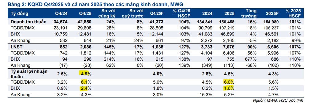 Bước sang năm 2026, VCBS dự báo doanh thu của MWG sẽ đạt mức 182,901 tỷ đồng và lợi nhuận sau thuế đạt 8,653 tỷ đồng, tăng trưởng 22.3% so với năm 2025.