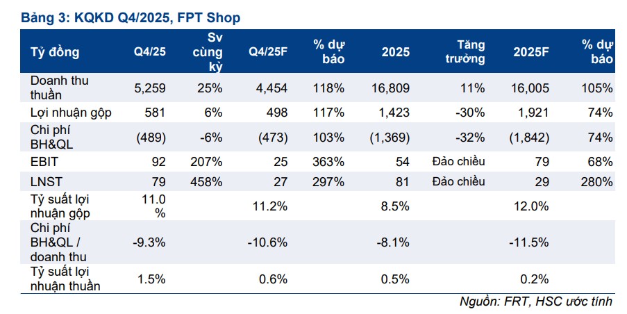 Theo HSC, FPT Shop gây bất ngờ với mức lợi nhuận 79 tỷ đồng, tăng gấp 6 lần so với cùng kỳ, vượt xa mức dự báo 27 tỷ đồng của HSC. Sự thành công này đến từ sức hút của dòng iPhone 17 (chiếm hơn 50% doanh thu chuỗi) cùng nhu cầu tăng cao đối với các dòng máy tính tích hợp AI. Thay vì mở rộng số lượng, FPT Shop tập trung vào hiệu quả trên từng điểm bán, đưa doanh thu bình quân cửa hàng tăng vọt lên 2.8 tỷ đồng/tháng.