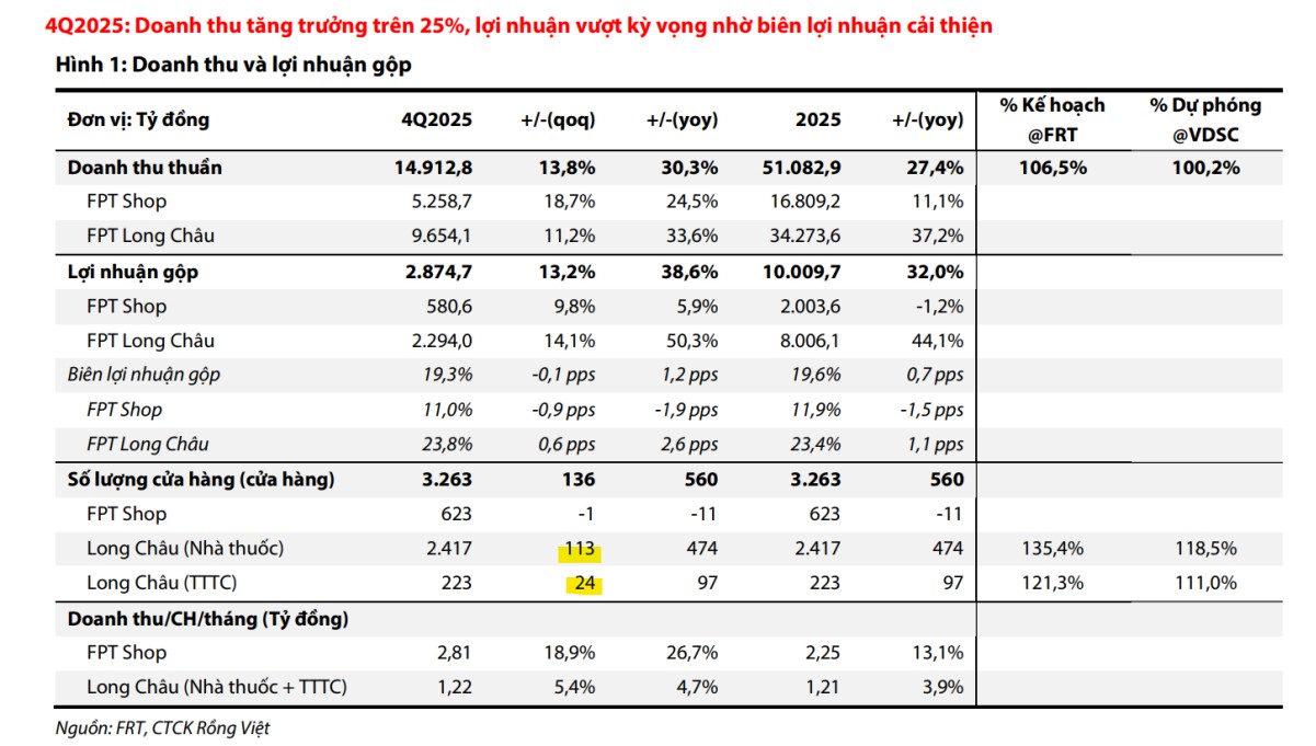 Sự kết hợp giữa đà tăng trưởng bền vững của chuỗi dược phẩm Long Châu và sự hồi phục mạnh mẽ của chuỗi FPT Shop đã giúp lợi nhuận sau thuế của cổ đông công ty mẹ tăng vọt 150% so với cùng kỳ, đạt 795 tỷ đồng, vượt 70% so với dự báo cả năm của VNDirect và vượt 7% dự báo của Vietcap.