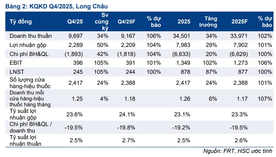 Doanh thu bình quân/cửa hàng Long Châu đạt 1.35 tỷ đồng/cửa hàng, cải thiện so với mức 1.2 tỷ đồng trong 2025. Biên LNG đi ngang và tỷ lệ SG&A/doanh thu cải thiện nhẹ giúp biên LNR đạt 2.8%, qua đó lợi nhuận ròng cả năm đạt 1,201 tỷ đồng (+33.1% YoY).