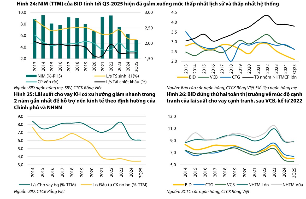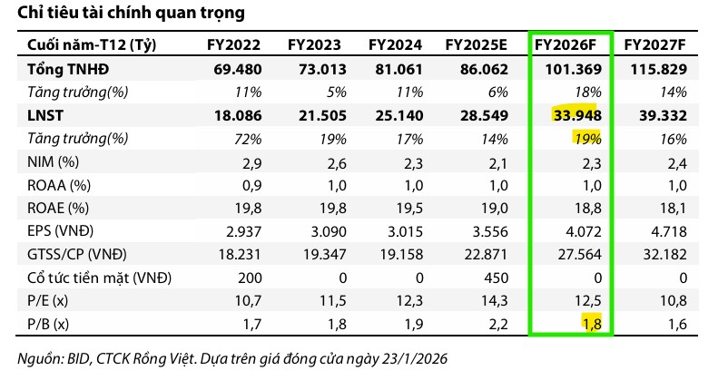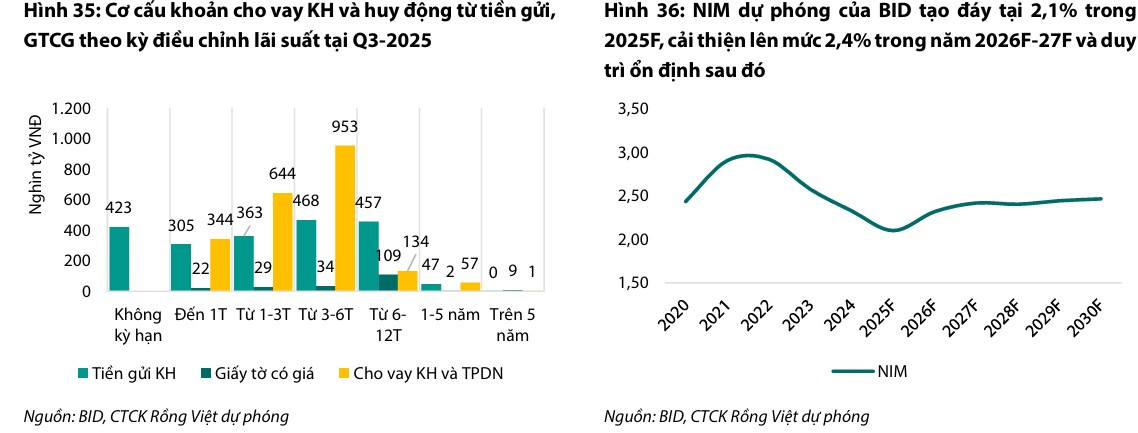Bước sang năm 2026, VDSC dự kiến lợi nhuận sau thuế của BIDV sẽ tăng trưởng bứt phá ở mức 19%, đạt gần 34 nghìn tỷ đồng, khi biên lãi ròng (NIM) bắt đầu phục hồi lên mức 2.3%. Sự cải thiện này đến từ việc dừng triển khai các gói lãi suất ưu đãi và tận dụng lợi thế của các khoản vay có kỳ điều chỉnh lãi suất ngắn hạn (1-6 tháng).