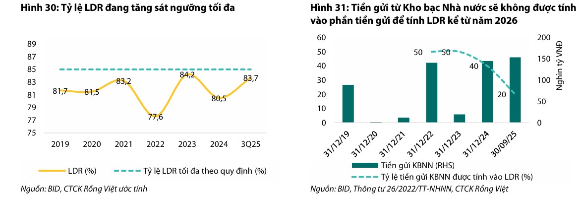 Cần chú ý, từ năm 2026, tiền gửi KBNN sẽ không còn được tính vào huy động để tính LDR tại các NHTM Nhà nước. Yếu tố này có thể sẽ khiến BID phải tăng cường huy động và kiểm soát cho vay trong ngắn hạn để bảo đảm tỷ lệ LDR trong mức quy định.