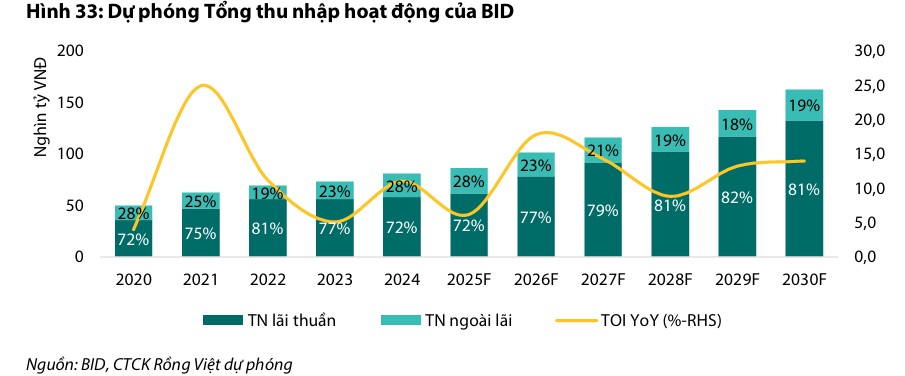 Do đó, Tổng thu nhập hoạt động (TOI) giai đoạn 2025F-30F dự kiến đạt mức tăng trưởng kép hàng năm (CAGR) là 14%, trong đó CAGR của thu nhập lãi thuần là 17% và của thu nhập ngoài lãi là 6%.